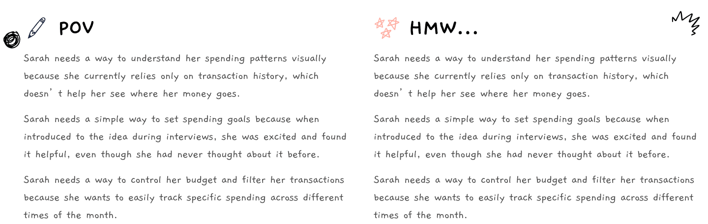 With that focus in place, I translated research insights into a clear Point of View statement, centered around users who want to understand their spending visually but currently rely only on history. These needs were reframed into targeted How Might We questions to guide ideation — ensuring the solution addressed clarity, control, and simplicity rather than adding unnecessary features.
