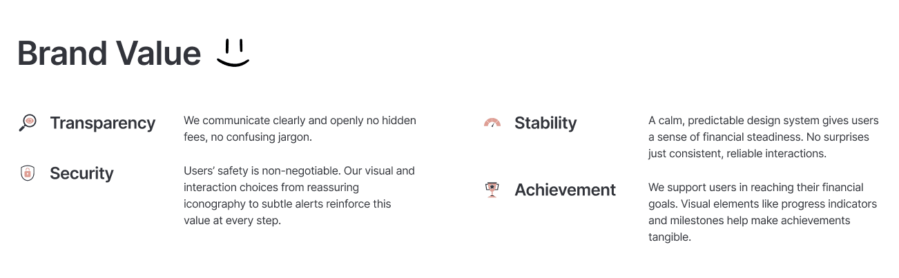 To bring the brand values into the interface, I translated Transparency, Security, Stability, and Achievement into a concrete visual system.