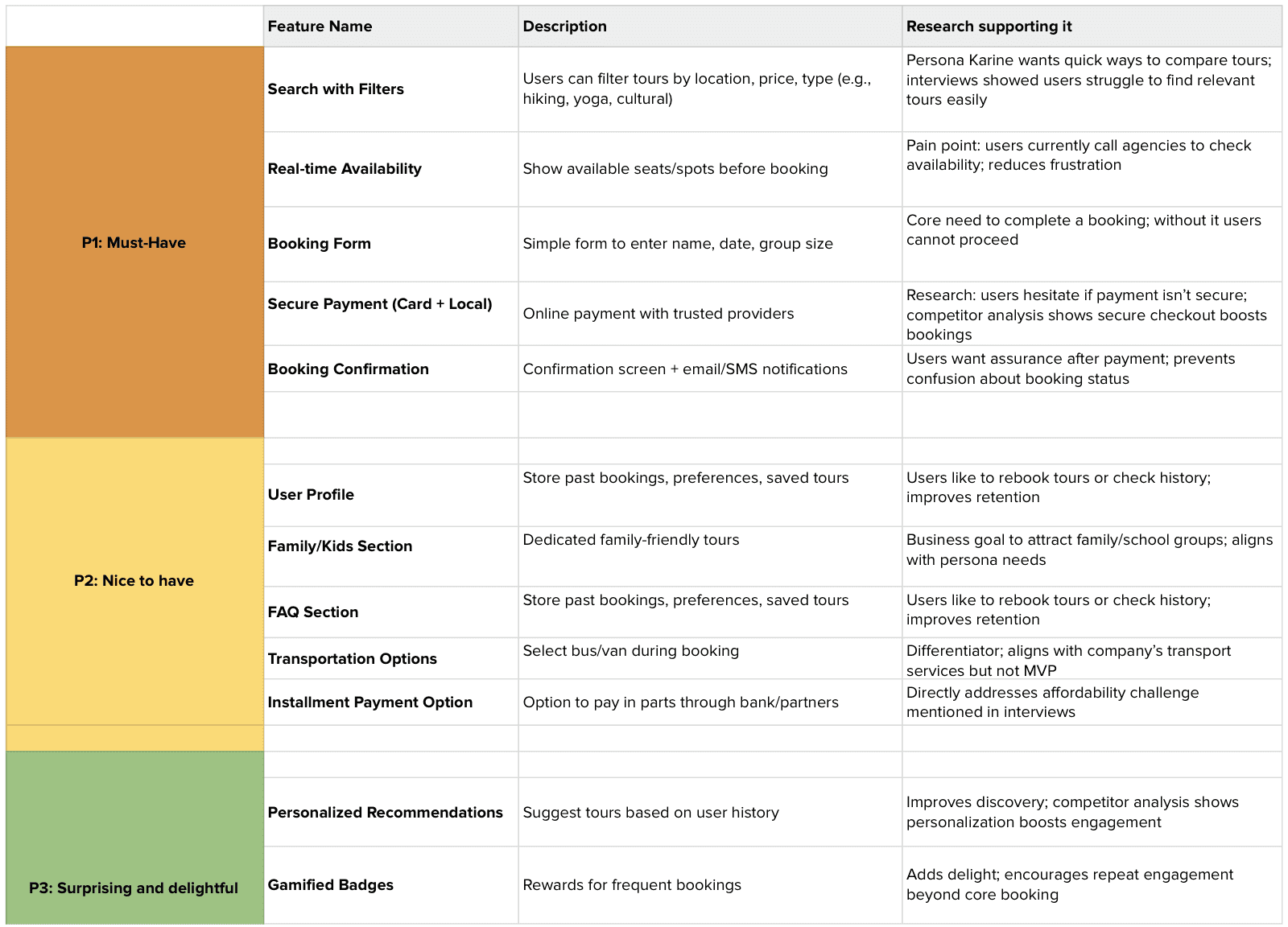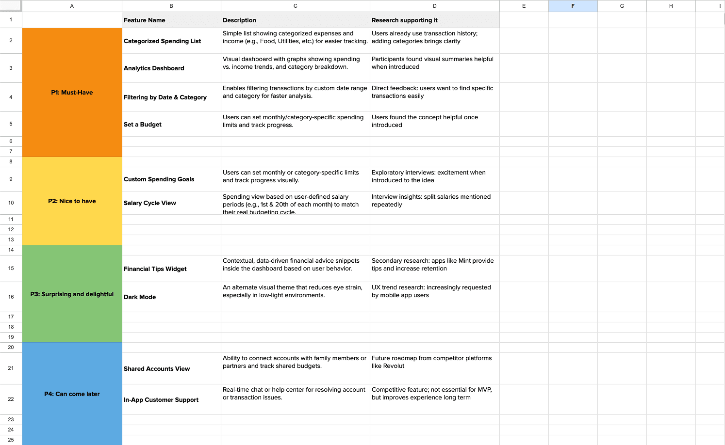 Finally, I converted those HMW questions into a structured feature set and prioritized them using the MoSCoW framework. Core features such as categorized spending, analytics dashboard, filtering by date and category, and budget setting were defined as Must-Haves. Goal-based tools and salary-cycle views were positioned as secondary enhancements, while contextual tips and dark mode were categorized as future delighters.