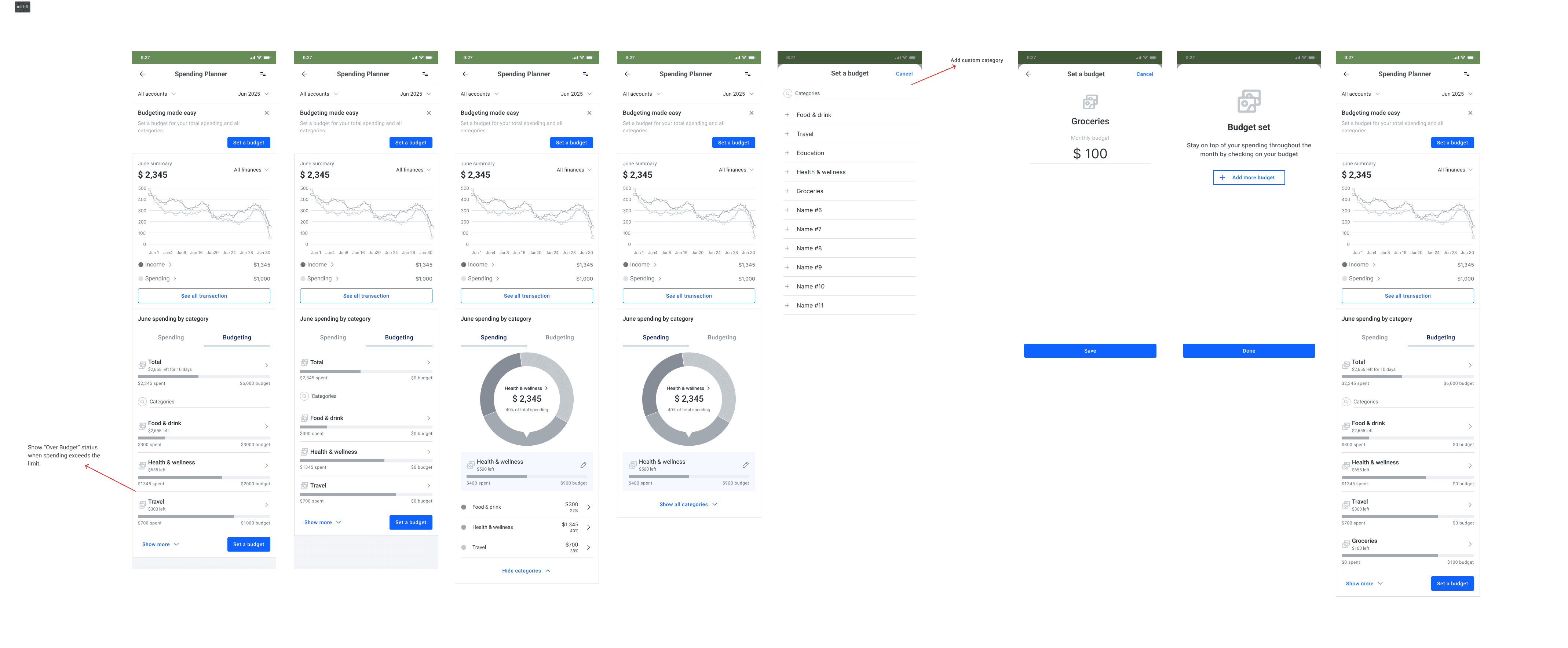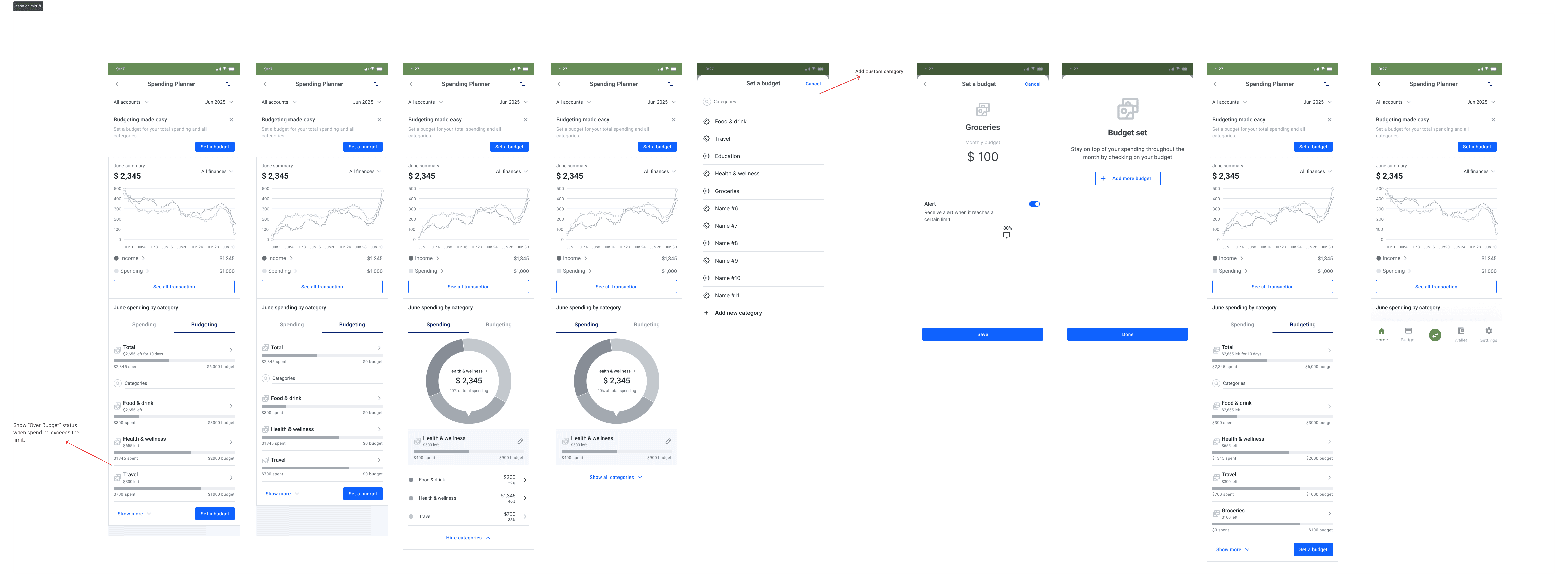 Based on the defined flows and prioritized features, I designed the first version of the budgeting screens. The focus was on making monthly spending immediately visible while keeping interactions simple and familiar within the InecoMobile interface.