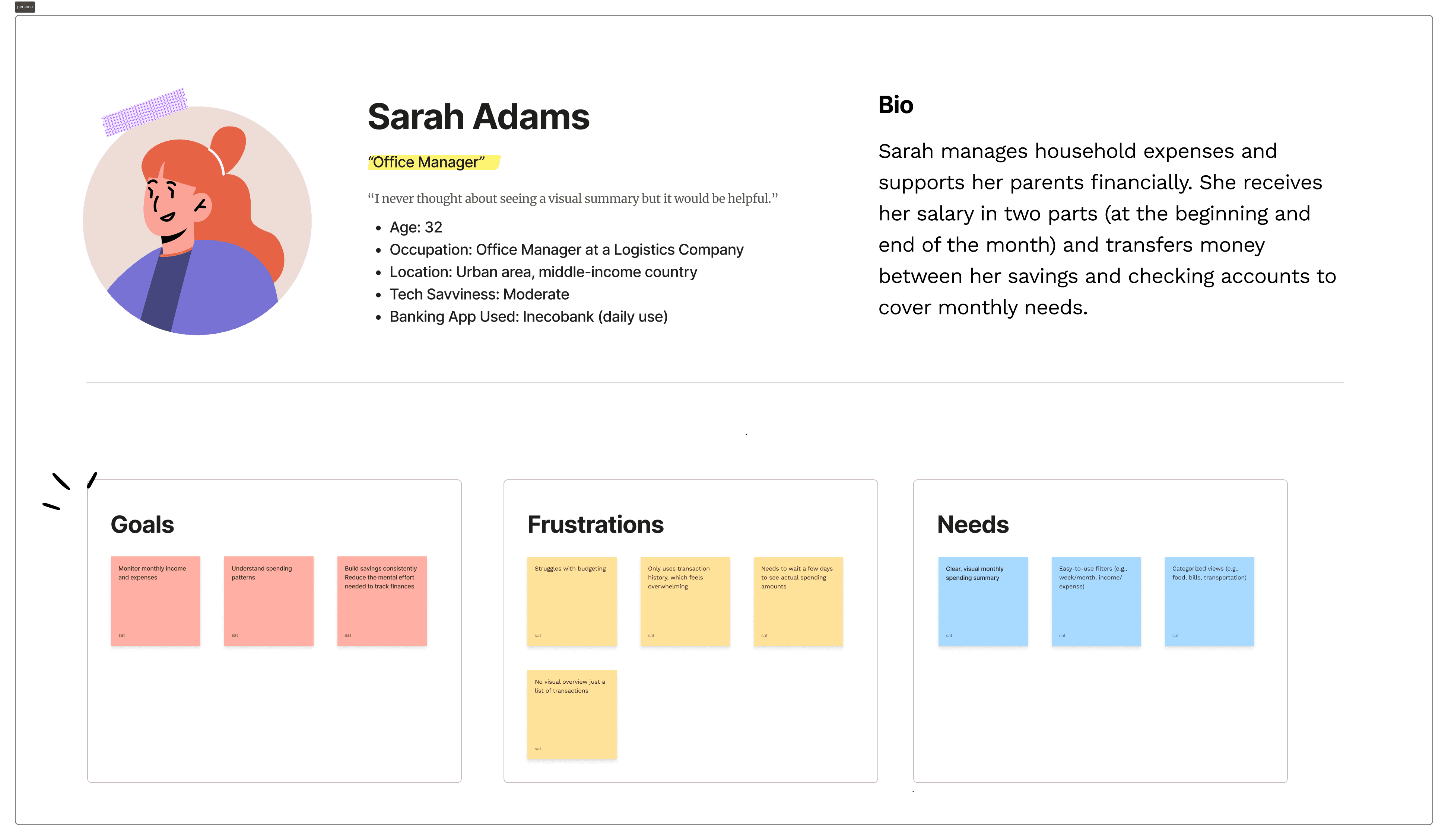 After analyzing interview findings through affinity mapping, I created a primary persona that represents the most common behaviors and needs observed during research.