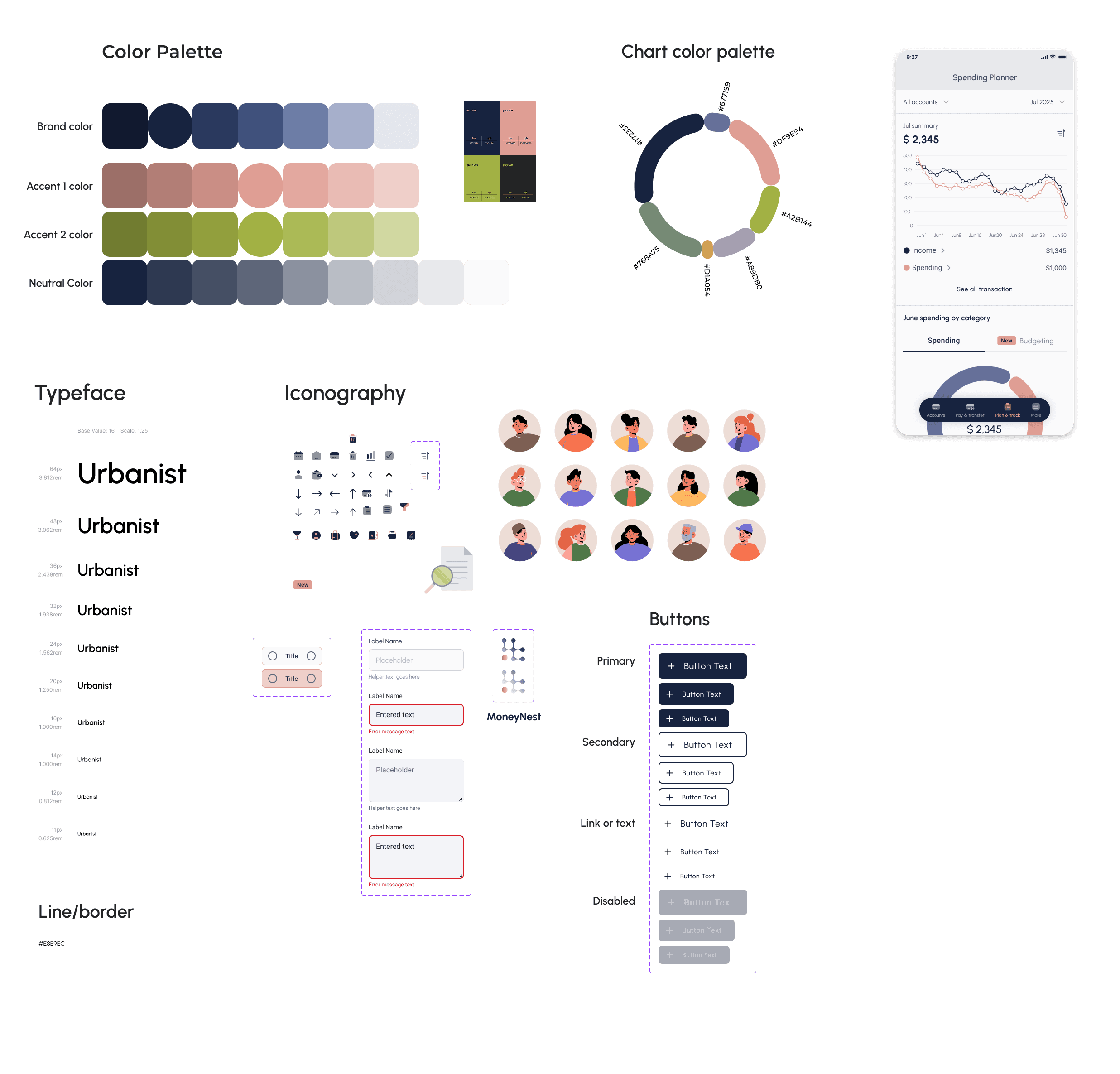 A structured blue-based palette reinforces trust and stability, while carefully selected accent colors support clarity in charts, categories, and alerts. The chart color system was designed to distinguish spending categories clearly without overwhelming the user. Neutral tones reduce cognitive load and keep financial data readable.