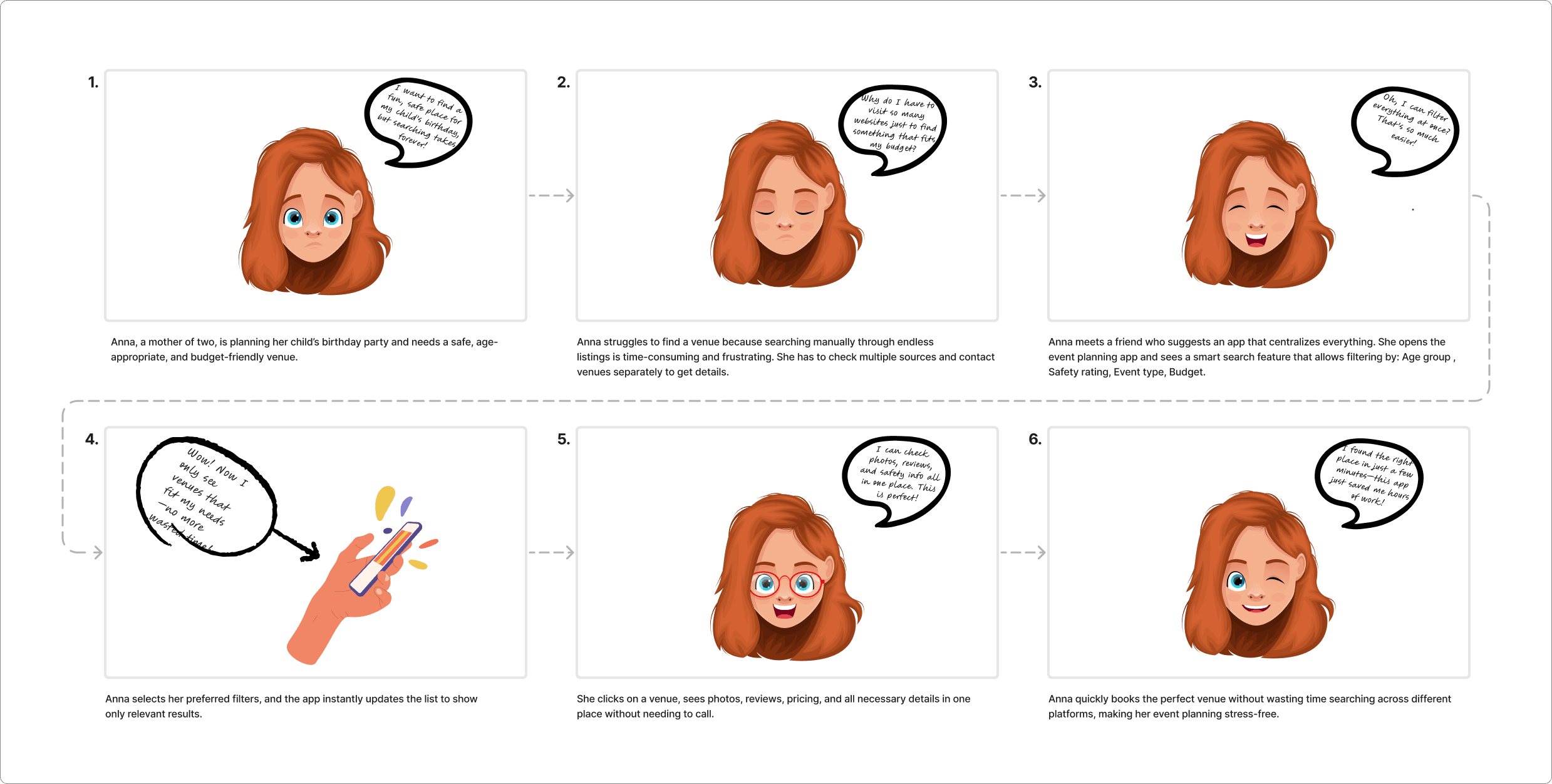 To better visualize how PlanZo would fit into a real user’s life, I created a storyboard that follows a typical journey of one of my key personas: Emily "The Family Event Organizer". This helped me design features that solve real problems in a relatable context.