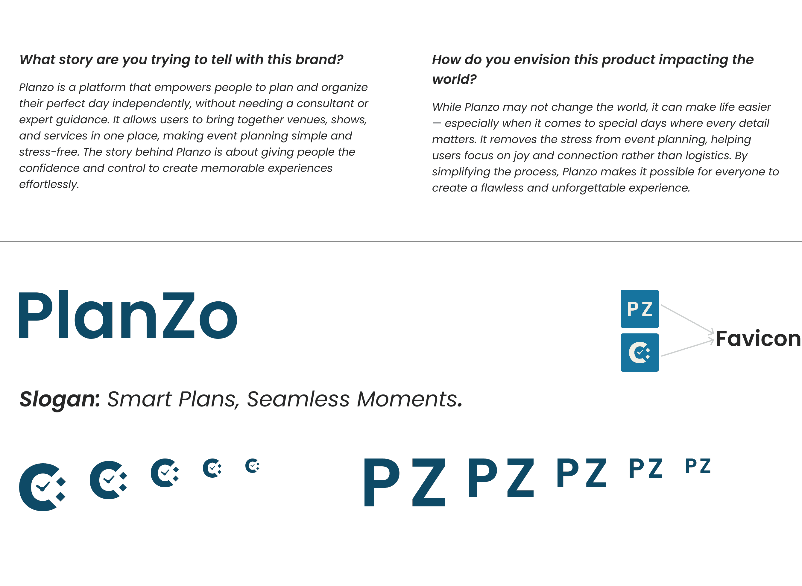Now that I had a clear direction for PlanZo’s branding, I began by brainstorming around the brand’s core values Accessibility, Capability, Joy, and Reliability. I sketched quick logo ideas that captured the celebratory and approachable nature of the platform.
