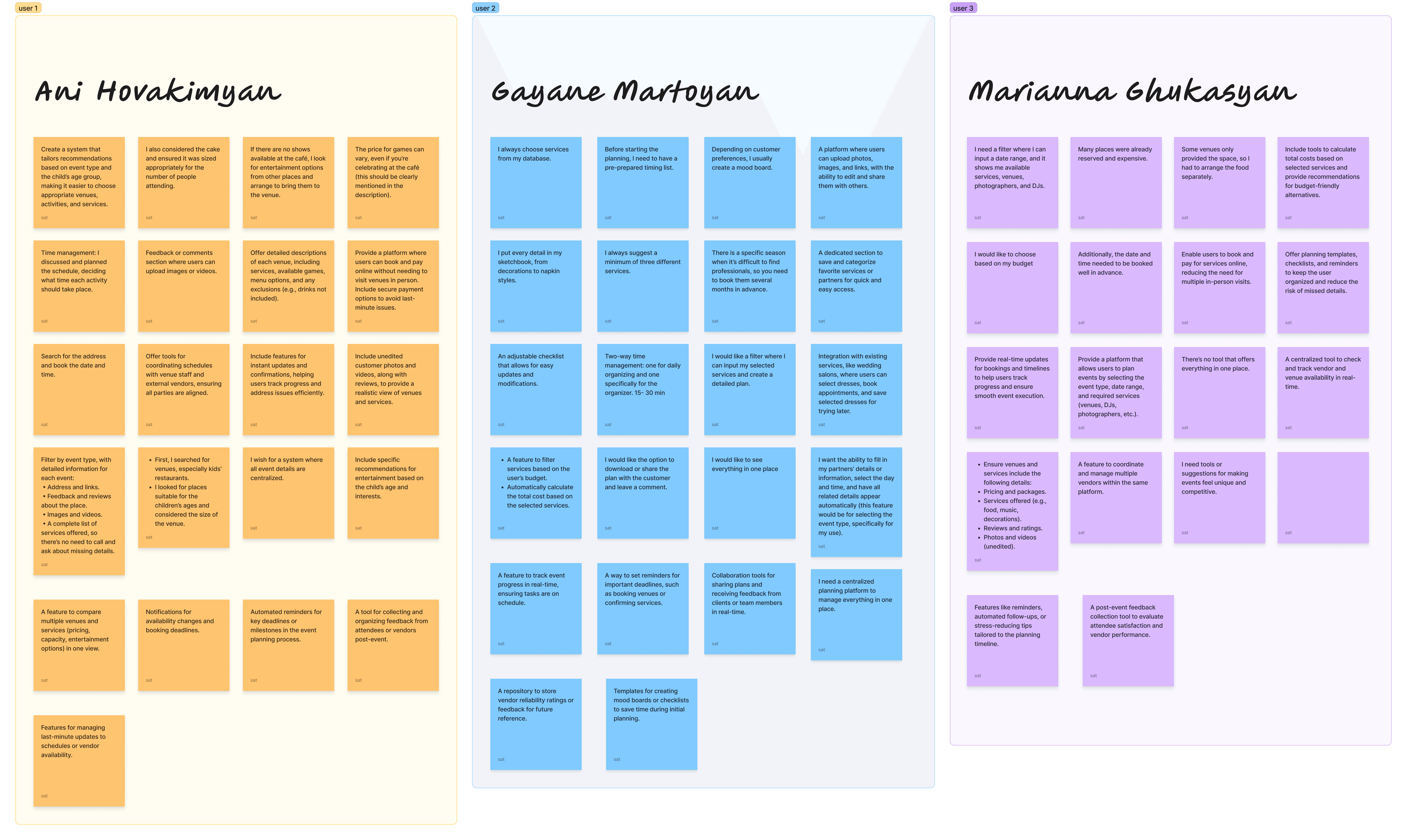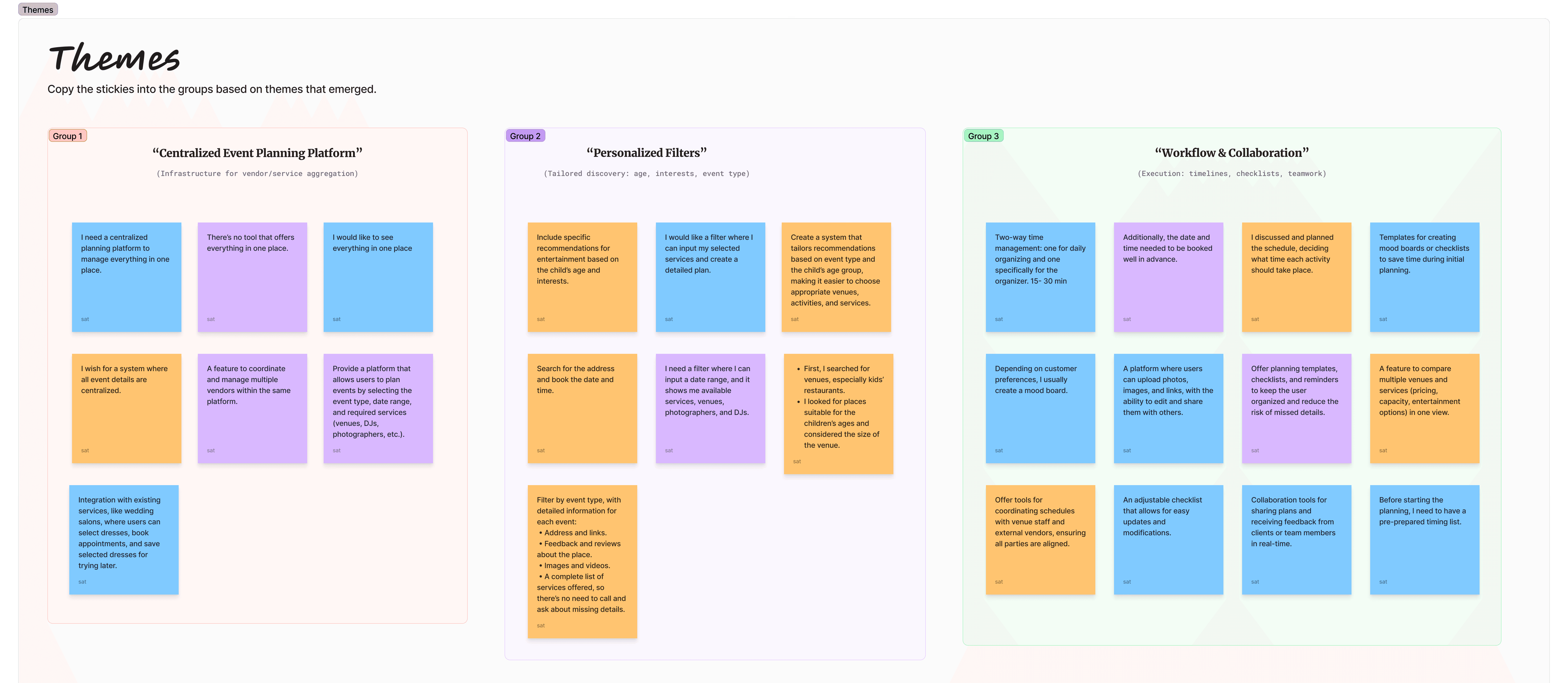After completing the interviews, I organized the findings using affinity mapping to identify common patterns, pain points, and unmet needs. This helped me synthesize qualitative data into actionable insights that would guide the design direction for PlanZo.