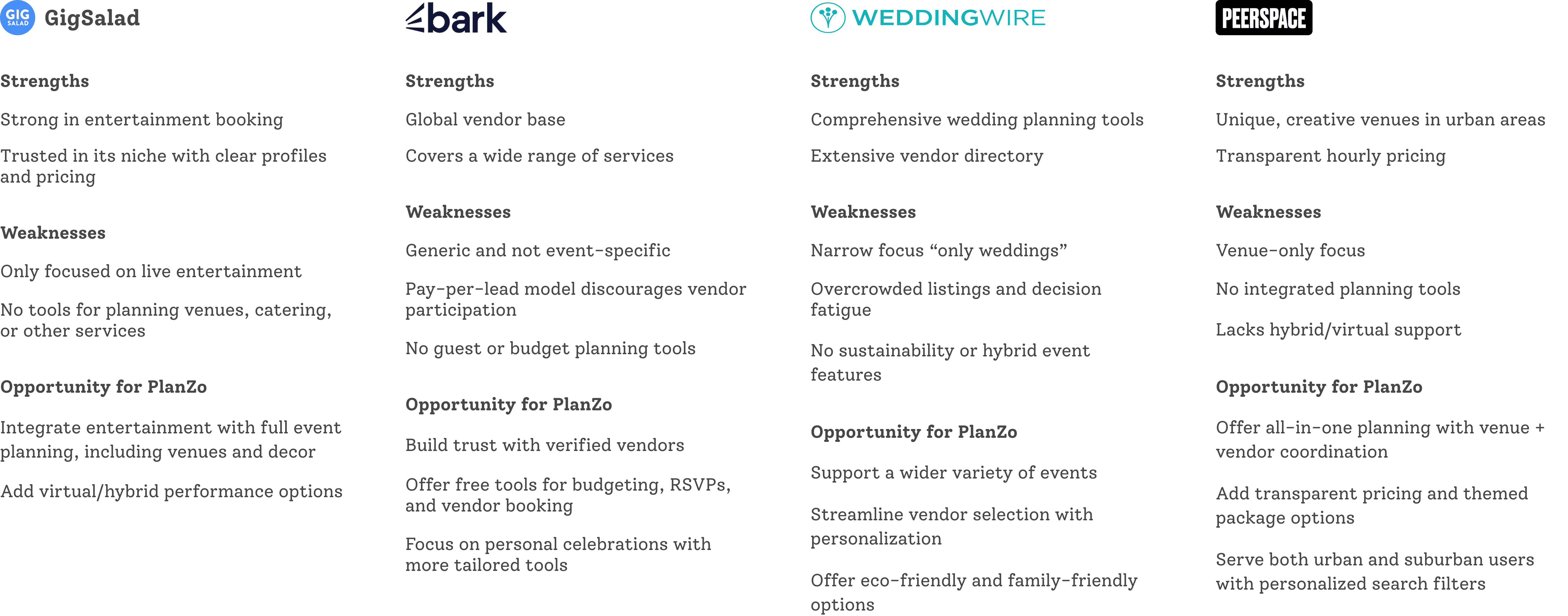 I analyzed four platforms to understand the current landscape of event planning tools. While each offers value in specific areas, none provides a fully centralized, all-in-one solution highlighting a clear opportunity for a more integrated approach like PlanZo.