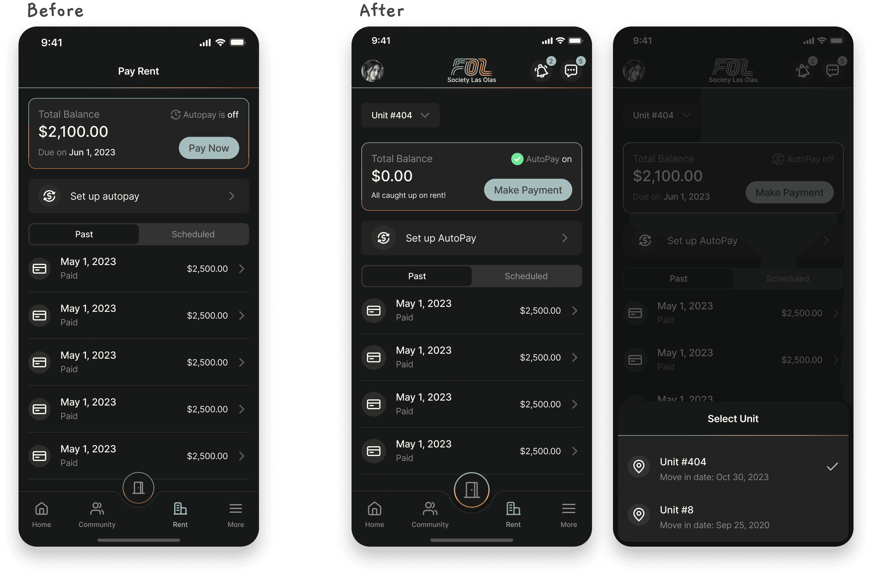 To solve this, a unit switcher was introduced, allowing residents to quickly switch between apartments while keeping balances and payment information separate for each unit.