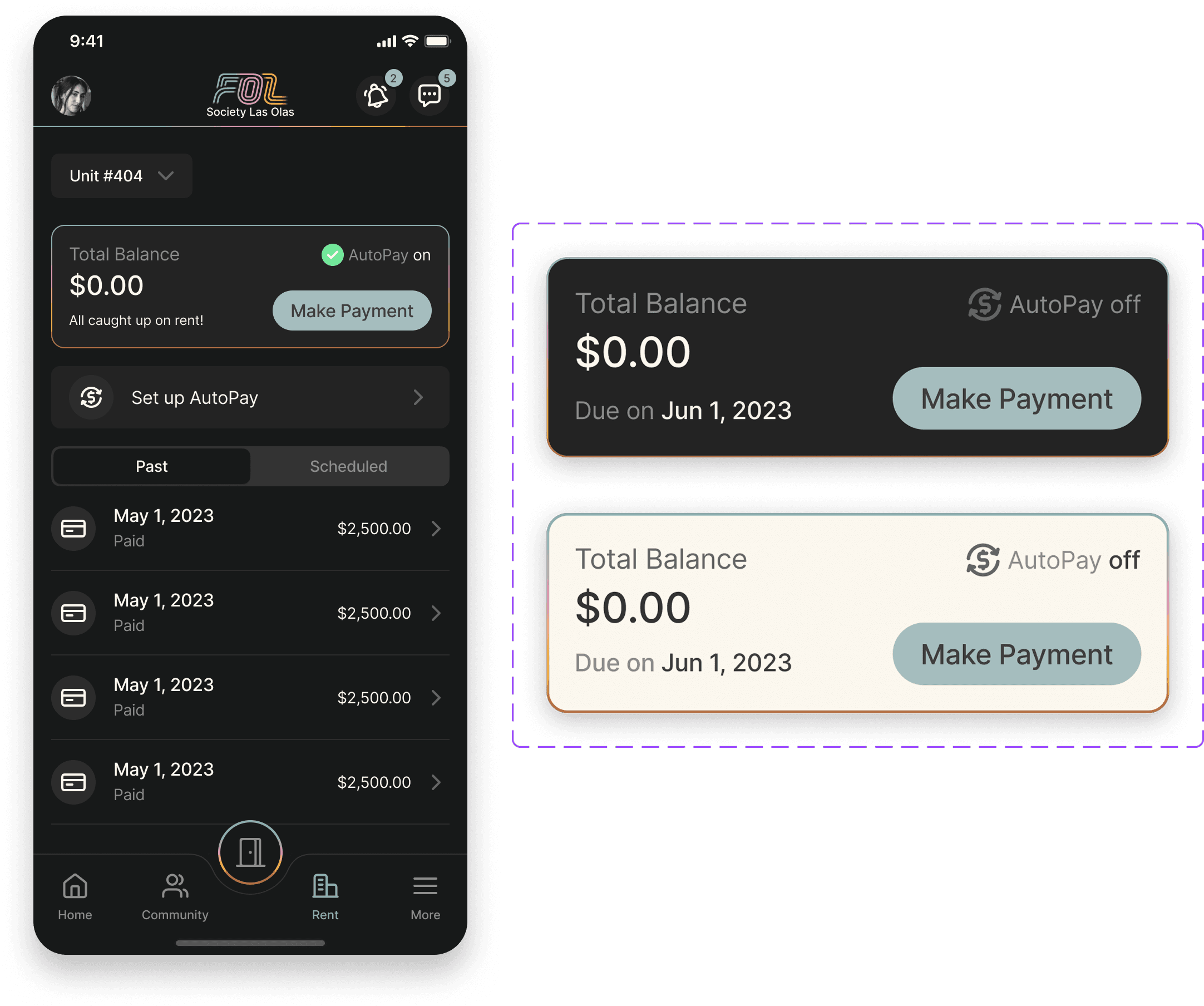 To support this, the interface highlights the total balance and due date at the top of the screen. The balance card adapts to different states — such as due soon, overdue, fully paid, or AutoPay enabled — helping residents immediately understand their payment situation and decide what action to take.